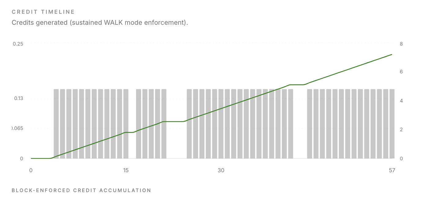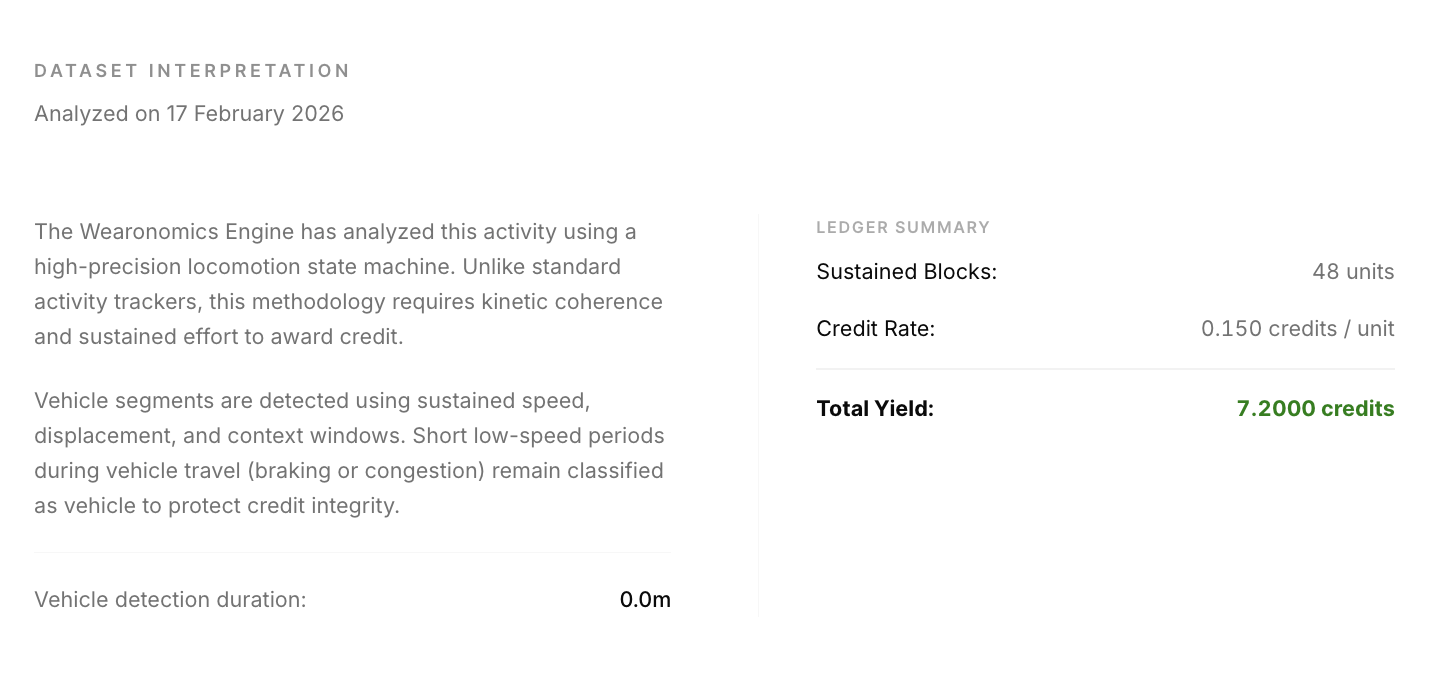 Following anomaly filtering and vehicle exclusion, the session generated 7.2000 Wearonomics Credits, reflecting 83.6% session eligibility for validated human locomotion within defined biomechanical parameters.