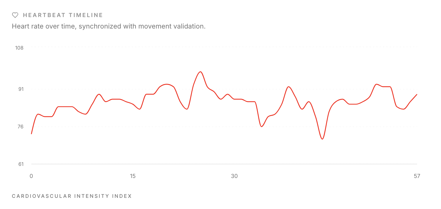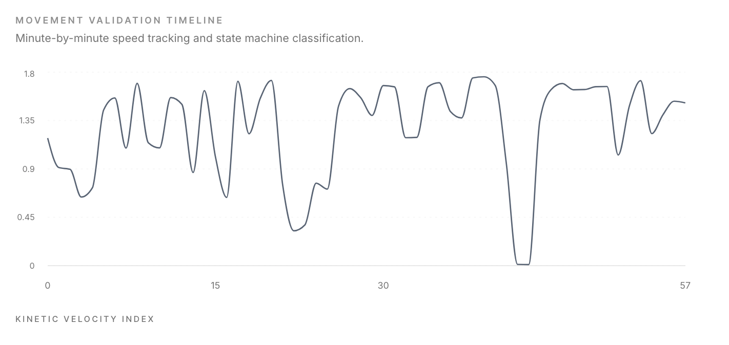 The Wearonomics Engine analyzed a session lasting 58 minutes, identifying 48.5 minutes of validated walking over 4.38 kilometers. The average walking velocity of 1.49 m/s remained within physiologically plausible human cadence thresholds.