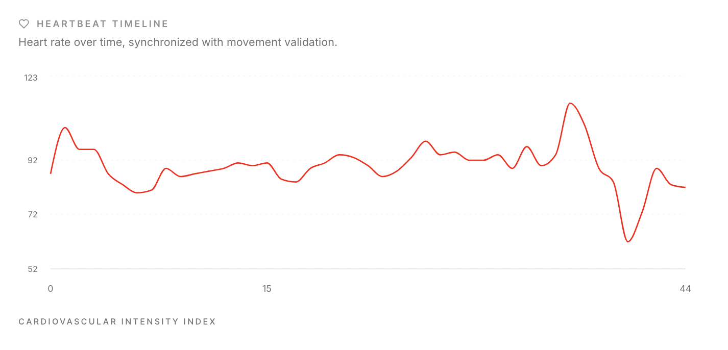 The Wearonomics Engine analyzed a session lasting 45 minutes, identifying 39.2 minutes of validated walking over 3.52 kilometers. The average walking velocity of 1.47 m/s remained within physiologically plausible human cadence thresholds.