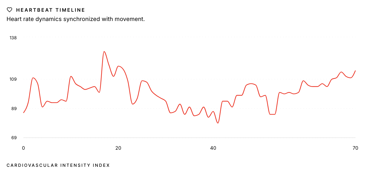 Heart rate dynamics ranged between 72 and 134 bpm, reflecting cardiovascular engagement consistent with sustained outdoor locomotion.
