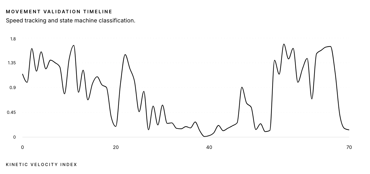 The Engine identified 210 pause intervals, the longest lasting 20 seconds. No major movement inconsistencies were detected, indicating high-fidelity sensor telemetry throughout the session window.