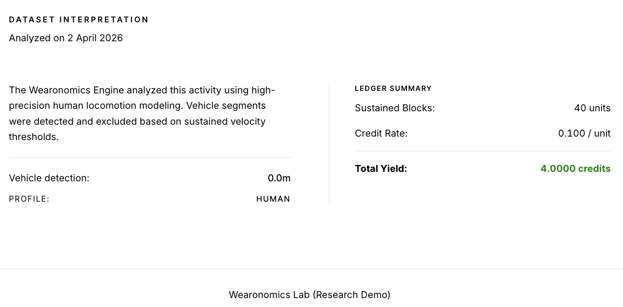Following anomaly filtering and vehicle exclusion, the session generated 4.0000 Wearonomics Credits, reflecting 55.1% session eligibility for validated human walking.